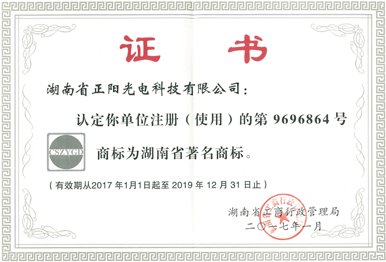 2017年2月28日,湖南省正陽光電科技有限公司榮獲湖南省著名商標。熱烈祝賀我公司榮獲湖南省著名商標!