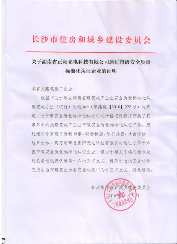 熱烈祝賀湖南省正陽光電科技有限公司通過市級(jí)安全質(zhì)量標(biāo)準(zhǔn)化認(rèn)證企業(yè)!